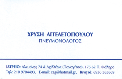 Πνευμονολόγοι - ΦυματιολόγοιΥγείαΑλκυόνης 74 & Αχιλλέως, Παλαιό ΦάληροΠΑΛΑΙΟ ΦΑΛΗΡΟ ΑΤΤΙΚΗΣΑΤΤΙΚΗΣΤΕΡΕΑ ΕΛΛΑΔΑ21097044936936565669cag@hotmail.comΚαθημερινά με ραντεβού. Μοιραστείτε τις πληροφορίες της επιχείρησής στα κοινωνικά δίκτυα: