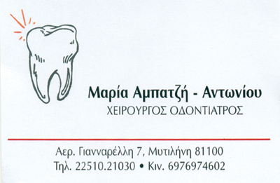ΟδοντίατροιΧειρουργοί ΟδοντίατροιΥγείαΑεροπόρου Γιανναρέλη 7, Μυτιλήνη, 81100ΜΥΤΙΛΗΝΗ ΛΕΣΒΟΥΛΕΣΒΟΣΝΗΣΙΑ ΑΙΓΑΙΟΥ ΠΕΛΑΓΟΥΣ22510210306976974602Ωράριο: Δευτέρα - Παρασκευή 09:30 - 12:30 Παρασκευή 18:00 - 20:00 κατόπιν ραντεβού Μοιραστείτε τις πληροφορίες της επιχείρησής στα κοινωνικά δίκτυα: