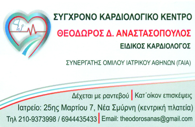 Ο ειδικός καρδιολόγος Αναστασόπουλος Θεόδωρος, απόφοιτος της Ιατρικής Σχολής του Πανεπιστημίου Αθηνών, διαθέτει μια μεγάλη εμπειρία σε θέματα κλινικής και προληπτικής καρδιολογίας έχοντας θητεύσει σε μερικά από τα πιο αξιόλογα νοσηλευτικά ιδρύματα της Ελλάδας (δείτε πιο κάτω το βιογραφικό του). Έχει συμμετάσχει σε πολλά συνέδρια και συνεχίζει να παρακολουθεί στενά και ενεργά τις εξελίξεις όχι μόνο της Καρδιολογίας αλλά και εν γένει της ιατρικής επιστήμης. Από το 2012 είναι συνεργάτης καρδιολόγος του ΙΑΤΡΙΚΟΥ ΚΕΝΤΡΟΥ ΑΘΗΝΩΝ (ΓΑΙΑ) ενώ από το 2013 διατηρεί ιδιωτικό καρδιολογικό ιατρείο στην περιοχή της Νέας Σμύρνης (25ης Μαρτίου 7, πάνω στην κεντρική πλατεία).