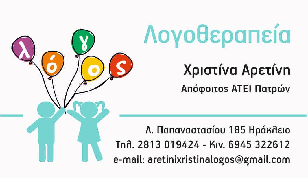 Η λογοθεραπεύτρια - λογοπεδικός Αρετίνη Χριστίνα είναι απόφοιτη του Τμήματος Λογοθεραπείας ΑΤΕΙ Πατρών και διατηρεί κέντρο λογοθεραπείας στο Ηράκλειο Κρήτης.