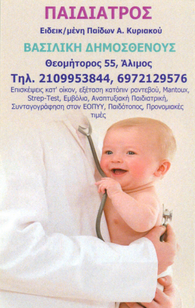 ΠαιδίατροιΥγείαΘεομήτορος 55, Άλιμος, ΑττικήΑΛΙΜΟΣ ΑΤΤΙΚΗΣΑΤΤΙΚΗΣΤΕΡΕΑ ΕΛΛΑΔΑ21099538446972129576diva25370@windowslive.comΠαιδίατρος Δέχεται 17:00 - 20:00 καθημερινά με ραντεβού. Επισκέψεις κατ΄οίκον με ραντεβού. Μοιραστείτε τις πληροφορίες της επιχείρησής στα κοινωνικά δίκτυα: