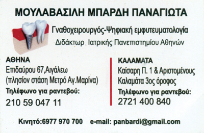 ΓναθοχειρουργοίΥγείαΕπιδαύρου 67, Αιγάλεω, ΑττικήΚαίσαρη Π. 1 & Αριστομένους, 3ος όροφος, ΚαλαμάταΑΙΓΑΛΕΩ ΑΤΤΙΚΗΣΑΤΤΙΚΗΣΤΕΡΕΑ ΕΛΛΑΔΑΚΑΛΑΜΑΤΑ ΜΕΣΣΗΝΙΑΣΜΕΣΣΗΝΙΑΠΕΛΟΠΟΝΝΗΣΟΣ2105904711272140084069779707002105904711panbardi@gmail.comΓναθοχειρούργος - εμφυτευματολόγος. Μοιραστείτε τις πληροφορίες της επιχείρησής στα κοινωνικά δίκτυα:
