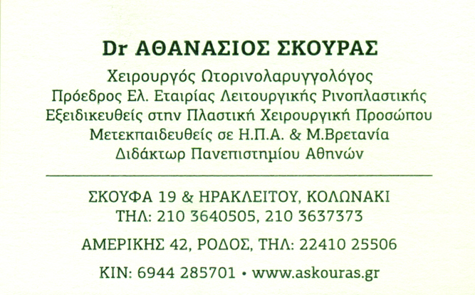 ΠΡΟΕΔΡΟΣ ΕΛΛΗΝΙΚΗΣ ΕΤΑΙΡΙΑΣ ΛΕΙΤΟΥΡΓΙΚΗΣ ΡΙΝΟΠΛΑΣΤΙΚΗΣ,ΕΞΕΙΔΕΙΚΕΥΘΕΙΣ,ΣΤΗΝ ΠΛΑΣΤΙΚΗ ΧΕΙΡΟΥΡΓΙΚΗ ΠΡΟΣΩΠΟΥ,ΜΕΤΕΚΠΑΙΔΕΥΘΕΙΣ ΣΕ ΗΠΑ&ΜΕΓ.ΒΡΕΤΑΝΙΑ,ΔΙΔΑΚΤΩΡ ΠΑΝ/ΜΙΟΥ ΑΘΗΝΩΝ,ΔΕΧΕΤΑΙ ΜΕ ΡΑΝΤΕΒΟΥ