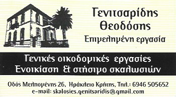 ΣκαλωσιέςΟικοδομικές Επιχειρήσεις και ΕργασίεςΔόμηση - ΚατοικίαΜελπομένης 26, ΗράκλειοΗΡΑΚΛΕΙΟ ΗΡΑΚΛΕΙΟΥΗΡΑΚΛΕΙΟΚΡΗΤΗ28151025926946505652skalosies.genitsaridis@gmail.comΜοιραστείτε τις πληροφορίες της επιχείρησής στα κοινωνικά δίκτυα: