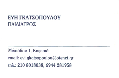 ΠαιδίατροιΥγείαΜιλτιάδου 1, ΚηφισιάΚΗΦΙΣΙΑ ΑΤΤΙΚΗΣΑΤΤΙΚΗΣΤΕΡΕΑ ΕΛΛΑΔΑ21080180386944281958evi.gkatsopoulou@otenet.grΔέχεται καθημερινά 18:00 - 20:00 όλα τα απογεύματα. Μοιραστείτε τις πληροφορίες της επιχείρησής στα κοινωνικά δίκτυα: