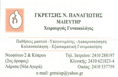 Μαιευτήρες - ΓυναικολόγοιΥγείαΝεοφύτου 2, Αγ.Αχίλλειος, ΛάρισαΛΑΡΙΣΑΘΕΣΣΑΛΙΑ241028819724105377596944736171gretsisp@yahoo.grΔέχεται 09:00 - 13:00 και 17:30 - 21:00 εκτός Πέμπτης απογεύματος Μοιραστείτε τις πληροφορίες της επιχείρησής στα κοινωνικά δίκτυα: