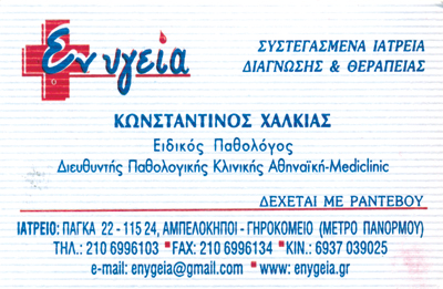 Ιατρικά - Διαγνωστικά Κέντρα και ΚλινικέςΥγείαΠάγκα 22, Γηροκομείο, Αμπελόκηποι, ΑθήναΑΜΠΕΛΟΚΗΠΟΙ ΑΤΤΙΚΗΣΑΤΤΙΚΗΣΤΕΡΕΑ ΕΛΛΑΔΑ21069961036937039025en.ygeia@gmail.comΔιευθυντής Παθολογικής Αθηναϊκής Κλινικής Medi Clinic. www.enygeia.grΜοιραστείτε τις πληροφορίες της επιχείρησής στα κοινωνικά δίκτυα: