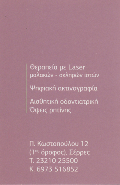 ΟδοντίατροιΧειρουργοί ΟδοντίατροιΧειρουργοί Οδοντίατροι - Αισθητικής ΟδοντιατρικήςΥγείαΠεριστέρη Κωστοπούλου 12, ΣέρρεςΣΕΡΡΕΣΜΑΚΕΔΟΝΙΑ23210255006973516852cheristanidou@gmail.comΟδοντιατρείο - Φανή ΧεριστανίδουΜοιραστείτε τις πληροφορίες της επιχείρησής στα κοινωνικά δίκτυα: