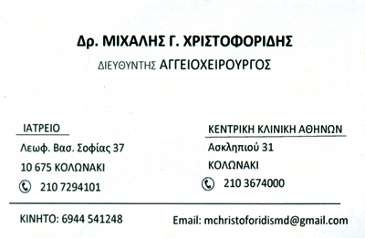 ΑγγειοχειρούργοιΥγείαΒασιλίσσης Σοφίας 37, Κολωνάκι, ΑθήναΑΘΗΝΑ ΑΤΤΙΚΗΣΑΤΤΙΚΗΣΤΕΡΕΑ ΕΛΛΑΔΑ21072941016944541248info@neoathinaiou.grΑγγειακές παθήσεις, θεραπεία κιρσών, διαβητικό πόδι www.aggeiologos-xristoforidis.grΜοιραστείτε τις πληροφορίες της επιχείρησής στα κοινωνικά δίκτυα: