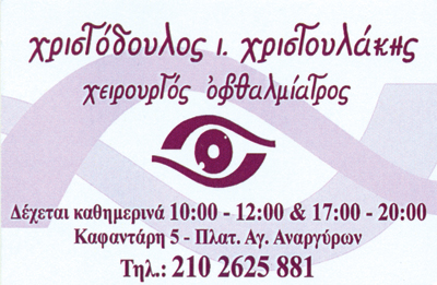 ΟφθαλμίατροιΥγείαΚαφαντάρη 5, Άγιοι ΑνάργυροιΑΓΙΟΙ ΑΝΑΡΓΥΡΟΙ ΑΤΤΙΚΗΣΑΤΤΙΚΗΣΤΕΡΕΑ ΕΛΛΑΔΑ21026258816982776189Καθημερινά 10:00-12:00 & 17:30-20:30, με ραντεβού Μοιραστείτε τις πληροφορίες της επιχείρησής στα κοινωνικά δίκτυα:
