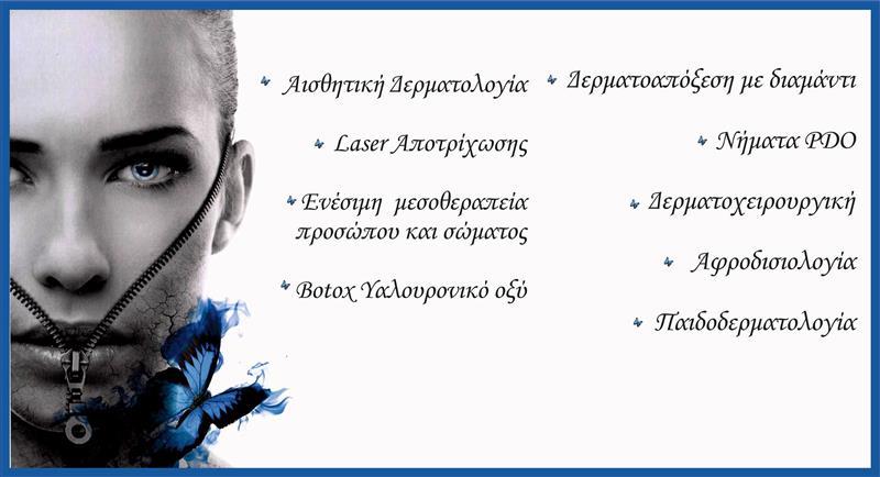 • Αισθητική Δερματολογία (Botox, Υαλουρονικό Οξύ, Μεσοθεραπεία, PRP, Peeilng, Ειδικές θεραπείες προσώπου και σώματος)