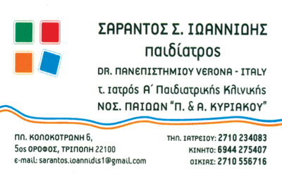 ΠαιδίατροιΥγείαΠλατεία Κολοκοτρώνη 6, ΤρίποληΤΡΙΠΟΛΗ ΑΡΚΑΔΙΑΣΑΡΚΑΔΙΑΠΕΛΟΠΟΝΝΗΣΟΣ27102340836944275407sarantos.ioannidis1@gmail.comΔέχεται αποκλειστικά κάθε πρωί με ραντεβού και Δευτέρα έως και Παρασκευή 18 -21:00 . Μοιραστείτε τις πληροφορίες της επιχείρησής στα κοινωνικά δίκτυα: