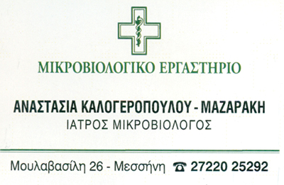 ΜικροβιολόγοιΜικροβιολόγοι - ΒιοπαθολόγοιΥγείαΜουλαβασίλη 26, ΜεσσήνηΜΕΣΣΗΝΗ ΜΕΣΣΗΝΙΑΣΜΕΣΣΗΝΙΑΠΕΛΟΠΟΝΝΗΣΟΣ2722025292kalogerpoyloyanastasia@gmail.comΚαθημερινά 07:30 -13:30 αιμοληψίες κατ' οίκον. Μοιραστείτε τις πληροφορίες της επιχείρησής στα κοινωνικά δίκτυα: