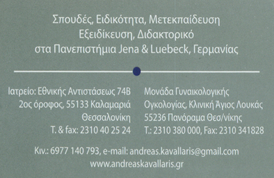 Ο Δρ. Ανδρέας Ν. Καβαλλάρης, με ειδικότητα Γυναικολόγου – Μαιευτήρα και εξειδίκευση στη Γυναικολογική Χειρουργική Ογκολογία και στη Λαπαροσκοπική Χειρουργική, σπούδασε και εξειδικεύτηκε στη Γερμανία και από το 2009 ως το 2011 διετέλεσε υποδιευθυντής της πανεπιστημιακής κλινικής του Lübeck της Γερμανίας.