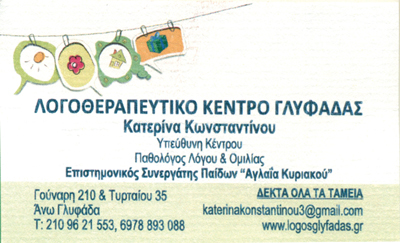 Η αγάπη και η ευαισθησία μας για τα παιδιά, μας οδήγησε στην συγκρότηση του Λογοθεραπευτικού Κέντρου Γλυφάδας πριν από 16 χρόνια. Σκοπός μας η άμεση και σωστή θεραπευτική παρέμβαση καθώς και η βελτίωση της καθημερινότητας τόσο των παιδιών όσο και των γονέων.Το Λογοθεραπευτικό Κέντρο Γλυφάδας, με υπεύθυνη την κα Κωνσταντίνου Κατερίνα, επιστημονική συνεργάτης Αναπτυξιακής Παιδιατρικής Κλινικής Παίδων Αγλαΐας Κυριακού με εξειδίκευση στις διάχυτες αναπτυξιακές διαταραχές (αυτισμός), διαθέτει ολοκληρωμένη επιστημονική ομάδα η οποία συγκροτείται από: Παιδοψυχιάτρους, Παιδοψυχολόγους, Λογοθεραπευτές, Εργοθεραπευτές, Ειδικούς Παιδαγωγούς, Ψυχολόγους Ενηλίκων.