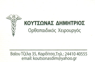 Ορθοπεδικοί ΙατροίΥγείαΒάϊου Τζέλλα 35, ΚαρδίτσαΚΑΡΔΙΤΣΑΘΕΣΣΑΛΙΑ2441040555koutsonasdim@yahoo.grΚαθημερινά πρωί - απόγευμα με ραντεβού. Μοιραστείτε τις πληροφορίες της επιχείρησής στα κοινωνικά δίκτυα: