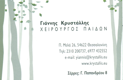 ΠαιδοχειρουργοίΥγείαΠαύλου Μελά 26, ΘεσσαλονίκηΓεωργίου Παπανδρέου 8, ΣέρρεςΘΕΣΣΑΛΟΝΙΚΗ ΘΕΣΣΑΛΟΝΙΚΗΣΣΕΡΡΕΣΘΕΣΣΑΛΟΝΙΚΗΜΑΚΕΔΟΝΙΑ23102007376977432552yiannis@krystallis.euwww.krystallis.euΜοιραστείτε τις πληροφορίες της επιχείρησής στα κοινωνικά δίκτυα:
