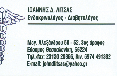 Ο διαβητολόγος - ενδοκρινολόγος Ιωάννης Λίτσας διατηρεί ιδιωτικό ιατρείο στη Θεσσαλονίκη. Σε ένα σύγχρονο και φιλικό προς τον ασθενή περιβάλλον, εξοπλισμένο με νέες τεχνολογίες, ο ιατρός προσφέρει διαγνώσεις και θεραπείες, που σχετίζονται με το θυρεοειδή, το σακχαρώδη διαβήτη και την οστεοπόρωση.