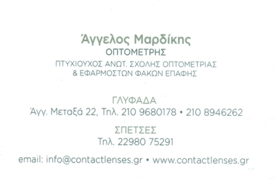 ΟπτικάΥγείαΛεωφόρος Δημάρχου Αγγέλου Μεταξά 22, ΓλυφάδαΓΛΥΦΑΔΑ ΑΤΤΙΚΗΣΑΤΤΙΚΗΣΤΕΡΕΑ ΕΛΛΑΔΑ210968017821089462622109680178info@contactlenses.grwww.contactlenses.grContactlenses.gr - Μαρδίκης Studio ΟπτικήςΜοιραστείτε τις πληροφορίες της επιχείρησής στα κοινωνικά δίκτυα: