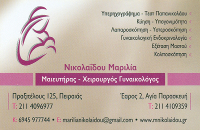 Μαιευτήρες - ΓυναικολόγοιΥγείαΠραξιτέλους 125, Πειραιάς, ΑττικήΈαρος 2, 1ος όροφος, Αγία Παρασκευή, ΑττικήΠΕΙΡΑΙΑΣ ΑΤΤΙΚΗΣΑΓΙΑ ΠΑΡΑΣΚΕΥΗ ΑΤΤΙΚΗΣΑΤΤΙΚΗΣΤΕΡΕΑ ΕΛΛΑΔΑ211409697721141093596945977744marilianikolaidou@gmail.com Υπέρηχογράφημα Τέστ ΠΑΠ Κύηση Υπογονιμότητα Λαπαροσκόπηση Υστεροσκόπηση Γυναικολογική Ενδοκρινολογία Εξέταση Μαστού Κολποσκόπηση www.mnikolaidou.grΜοιραστείτε τις πληροφορίες της επιχείρησής στα κοινωνικά δίκτυα: