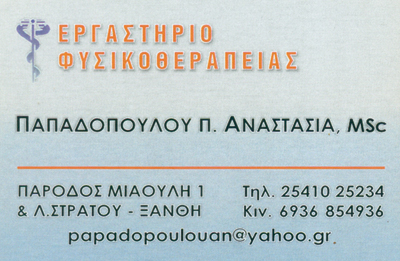 ΦυσικοθεραπευτέςΥγείαΠάροδος Μιαούλη 1 και Λεωφόρος Στράτου, ΞάνθηΞΑΝΘΗΘΡΑΚΗ25410252346936854936papadopoulouan@yahoo.grΚαθημερινά 09:00 - 13:00 και 17:00 -20:30 με ραντεβού. Μοιραστείτε τις πληροφορίες της επιχείρησής στα κοινωνικά δίκτυα: