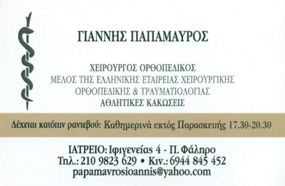 Ορθοπεδικοί ΙατροίΥγείαΙφιγένειας 4, Παλαιό Φάληρο, ΑθήναΠΑΛΑΙΟ ΦΑΛΗΡΟ ΑΤΤΙΚΗΣΑΤΤΙΚΗΣΤΕΡΕΑ ΕΛΛΑΔΑ21098236296944845452papamavrosioannis@yahoo.grΔέχεται καθημερινά 17:30 - 20:30 πλην Παρασκευής Μοιραστείτε τις πληροφορίες της επιχείρησής στα κοινωνικά δίκτυα:
