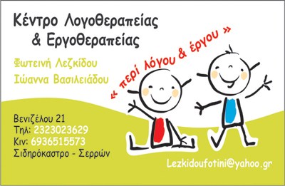 Λογοπεδικοί - ΛογοθεραπευτέςΥγείαΣΙΔΗΡΟΚΑΣΤΡΟ ΣΕΡΡΩΝΣΕΡΡΕΣΜΑΚΕΔΟΝΙΑ23230236296936515573lezkidoufotini@yahoo.grΜοιραστείτε τις πληροφορίες της επιχείρησής στα κοινωνικά δίκτυα: