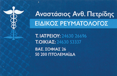 ΡευματολόγοιΥγείαΒασιλίσσης Σοφίας 26, ΠτολεμαϊδαΠΤΟΛΕΜΑΪΔΑ ΚΟΖΑΝΗΣΚΟΖΑΝΗΜΑΚΕΔΟΝΙΑ24630266966932293888petridisan@yahoo.grΩράριο: Δευτέρα - Παρασκευή 09:00 - 13:00 & 17:30 - 20:00 εκτός Τετάρτης απογεύματος Μοιραστείτε τις πληροφορίες της επιχείρησής στα κοινωνικά δίκτυα: