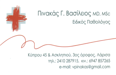 ΠαθολόγοιΥγείαΚύπρου 45 & Ασκληπιού, ΛάρισαΛΑΡΙΣΑΘΕΣΣΑΛΙΑ241028791569478572652410287625vpinakas@gmail.comMSC Πρωτοβάθμια φροντίδα υγείας πανεπιστημίου Θεσσαλίας. Μοιραστείτε τις πληροφορίες της επιχείρησής στα κοινωνικά δίκτυα: