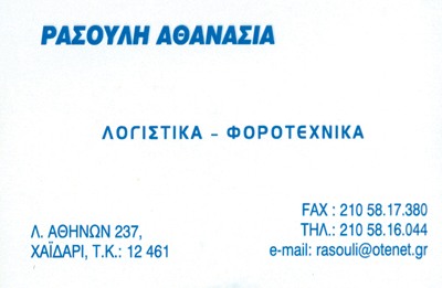 Λογιστικές- Φοροτεχνικές ΥπηρεσίεςΥπηρεσίεςΛεωφόρος Αθηνών 237, ΧαϊδάριΧΑΪΔΑΡΙ ΑΤΤΙΚΗΣΑΤΤΙΚΗΣΤΕΡΕΑ ΕΛΛΑΔΑ21058160442105817380rasouli@otenet.grΜοιραστείτε τις πληροφορίες της επιχείρησής στα κοινωνικά δίκτυα: