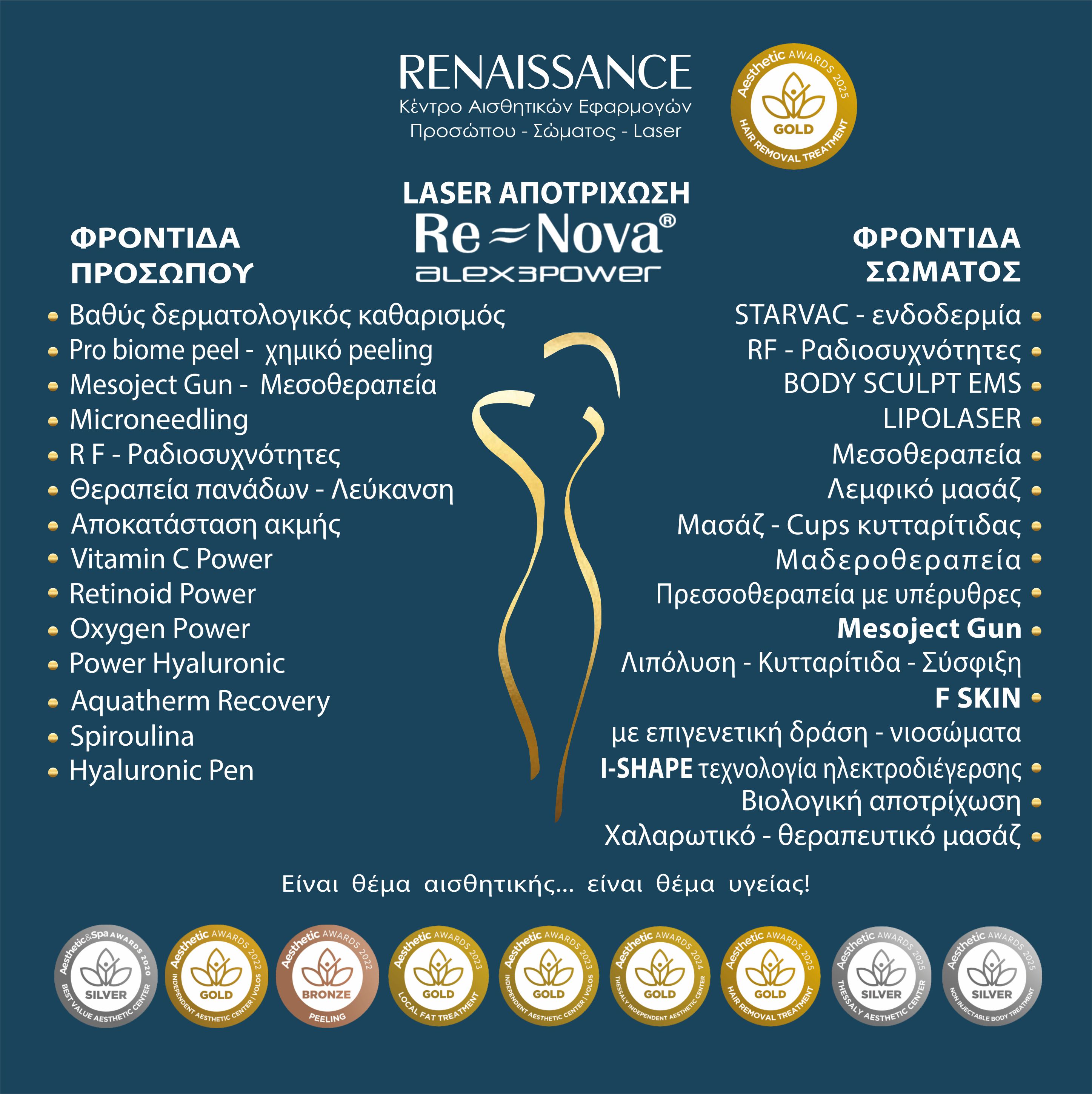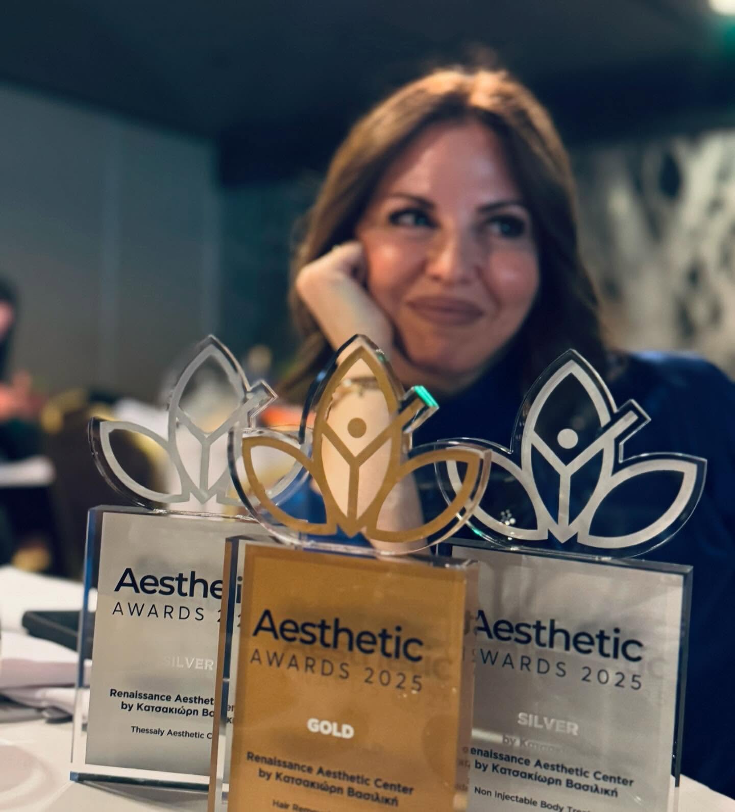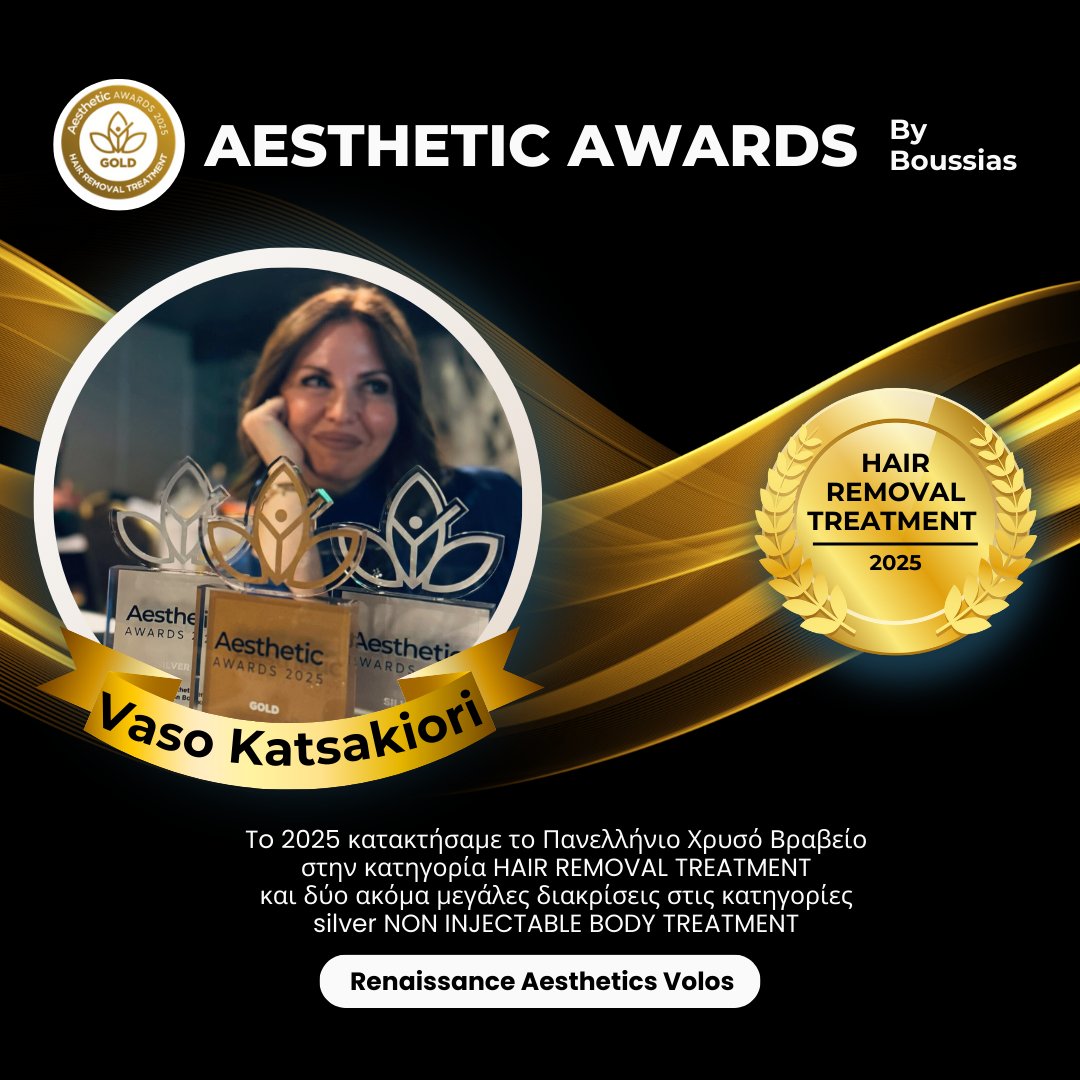 - HAIR REMOVAL TREATMENT - 2025 Μετά από χρόνια επιτυχιών στη Θεσσαλία, το Renaissance aesthetics κατέκτησε το Πανελλήνιο Χρυσό Βραβείο στην κατηγορία: Hair Removal treatment, καθώς και SIlver Award στις κατηγορίες NON INJECTABLE BODY TREATMENT και THESSALY AESTHETIC CENTER. Για 5η συνεχόμενη χρονιά βραβευόμαστε για την αποτελεσματικότητα και την αφοσίωσή μας στην αισθητική, την ποιότητα, την καινοτομία και φυσικά την εξέλιξη μας στην τεχνολογία.