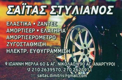 Βουλκανιζατέρ ΕλαστικώνAuto - MotoΙ. Μέρλα 60 και Αγίου Νικολάου 90, Άγιοι ΑνάργυροιΑΓΙΟΙ ΑΝΑΡΓΥΡΟΙ ΑΤΤΙΚΗΣΑΤΤΙΚΗΣΤΕΡΕΑ ΕΛΛΑΔΑ2102639570saitas.dimitris@gmail.coms.saitas@mail.grΕλαστικά, ζάντες, αμορτισέρ, ελατήρια, αμορτισόμετρο ζυγοστάθμιση, ηλεκτρ. ευθυγράμμιση. www.saitas.grΜοιραστείτε τις πληροφορίες της επιχείρησής στα κοινωνικά δίκτυα: