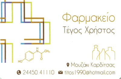 ΦαρμακείαΥγείαΛεωφόρος Δημάρχου Αντώνη Βασιλείου 75, ΜουζάκιΜΟΥΖΑΚΙ ΚΑΡΔΙΤΣΑΣΚΑΡΔΙΤΣΑΘΕΣΣΑΛΙΑ244504111069789026646977529695titos1990@hotmail.comΣυστεγασμένα Φαρμακεία ΤΕΓΟΣΜοιραστείτε τις πληροφορίες της επιχείρησής στα κοινωνικά δίκτυα: