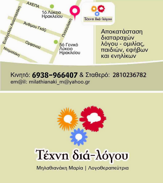 Λογοπεδικοί - ΛογοθεραπευτέςΥγείαΠιτσουλάκη 21, ΗράκλειοΗΡΑΚΛΕΙΟ ΗΡΑΚΛΕΙΟΥΗΡΑΚΛΕΙΟΚΡΗΤΗ28102367826938966407texnidialogou@gmail.comwww.texnidialogou.grΤέχνη Διαλόγου Μηλαθιανάκη ΜαρίαΜοιραστείτε τις πληροφορίες της επιχείρησής στα κοινωνικά δίκτυα: