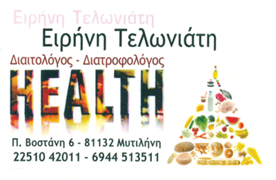 Διαιτολόγοι και Σύμβουλοι ΥγιεινήςΥγείαΠ. Βοστάνη 6, 1ος όροφος, ΜυτιλήνηΜΥΤΙΛΗΝΗ ΛΕΣΒΟΥΛΕΣΒΟΣΝΗΣΙΑ ΑΙΓΑΙΟΥ ΠΕΛΑΓΟΥΣ22510420116944513511Μοιραστείτε τις πληροφορίες της επιχείρησής στα κοινωνικά δίκτυα: